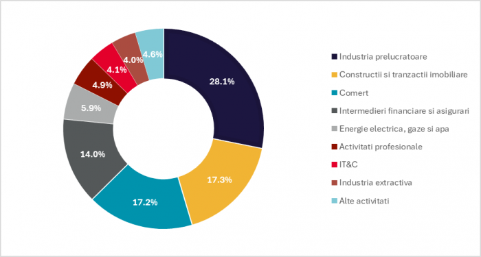 Aceste dinamici au modificat ponderile relative în soldul total: industria a scăzut de la 48,4% la 37,1%, în timp ce sectorul imobiliar și al construcțiilor a crescut cu 6,7 puncte procentuale, iar comerțul cu 6,4 puncte procentuale.