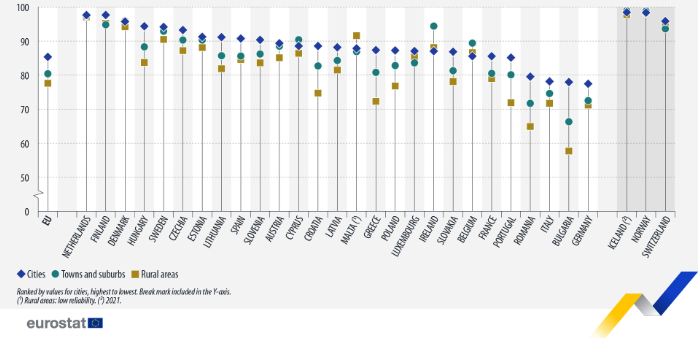 În contrast, țări precum Olanda, Finlanda și Danemarca înregistrează valori de peste 95% în aproape toate mediile de rezidență. Mai mult, în unele cazuri, precum Malta sau Cipru, zonele rurale sau suburbiile depășesc orașele.