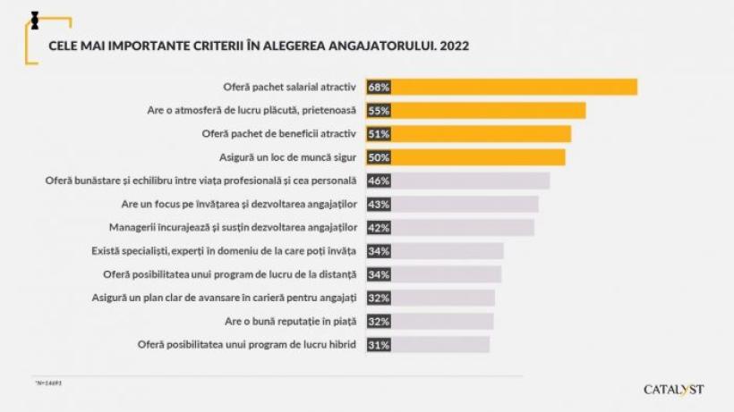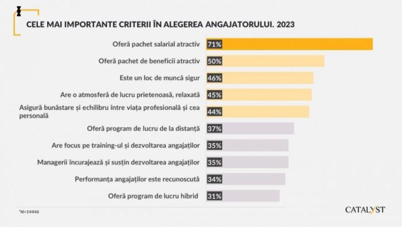 Spre exemplu, 71% dintre respondenți aleg angajatorul în funcție de pachetul salarial pe care acesta îl pune la dispoziție. Pentru 50% dintre candidați este important să aibă acces la beneficii atractive. Starea de wellbeing la locul de muncă poate fi asigurată printr-un job sigur, printr-o atmosferă de lucru plăcută și prin echilibrul dintre viața profesională și cea personală a angajatului. Cele 3 argumente se regăsesc în topul criteriilor de alegere a angajatorului pentru 14.446 de respondenți.