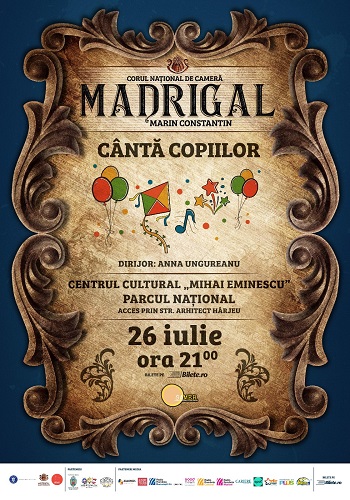 Duminică, 26 iulie 2020, de la ora 21:00, Corul Național de Cameră „Madrigal – Marin Constantin”, dirijat de Anna Ungureanu, invită publicul la „Madrigal cântă copiilor”, al doilea eveniment din Stagiunea estivală în aer liber.