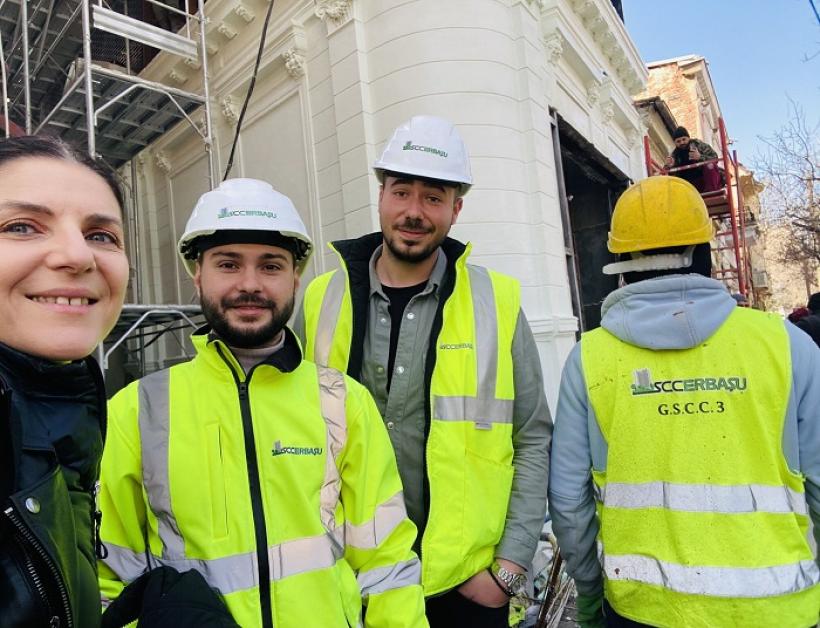 „În 2 ore inginerii Cătălin Stoica ( în foto vesta roșie) și Gabriel Bratu (cu un sul de planșe în mână) au fost în șantier și au evaluat dezastrul. A doua zi dimineață, la ora 7.00, echipa condusă de inginerii Gabriel Cocină, Adrian Giurgiulescu și dl Ilie Beudean și formată din 50 de muncitori au montat jumătate de schelă iar a treia zi tot teatrul era tapat. A patra zi au început structura fațadei de corten iar astăzi, după două săptămâni de lucrat zi lumină, a fost descoperită fațada de la stradă, urmând ca până luni să fie gata și fațada de pe lateral. Și toată această muncă, tot acest efort nebun, toată această dăruire necondiționată a fost făcută PRO BONO”, a continuat Chris Simion-Mercurian.
