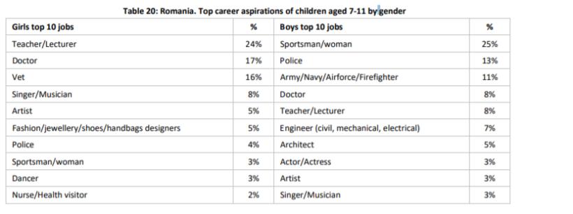 Cele mai populare dorințe de cariere ale copiilor români sunt extrem de concentrate în câteva ocupații, la fel ca în multe alte țări, de obicei cele care vizează celebrități (sportiv / sportivă la 15%), cariere tradiționale (doctor 16% și veterinar 12%), serviciu public (polițist 10%, profesor 20%).