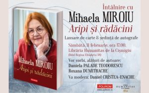 Librăria Humanitas - Cișmigiu va găzdui, sâmbătă, 11 februarie, începând cu ora 17.00, lansarea cărții ”Aripi și rădăcini”, volum ce poartă semnătura Mihaelei Miroiu.