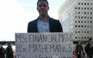 Cedrik von Stumm, un tânăr de origine germană, sătul să trimită CV-uri fără a primit răspuns, a decis să iasă în stradă cu o pancartă, la Londra, pentru a se „vinde” direct. Tânărul de 23 de ani e proaspăt absolvent al unui master în Matematică și Finanțe, obținut la King’s College. -