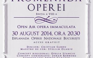 Sambata, 30 august, de la ora 20.30, are loc cea de-a opta editie a Promenada Operei. Sarbatoarea are loc pe esplanada Operei, pe notele ariilor si duetelor celebre conduse de dirijorul Cristian Sandu, eveniment de la care nu vor lipsi pasii de balet, in conceptia coregrafica a lui Johan Kobborg, Directorul Baletului National Roman.