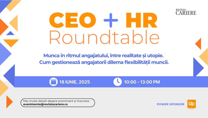 Revista CARIERE revine cu o nouă ediție a evenimentului dedicat liderilor din business și resurse umane: CEO+HR Roundtable: Munca în ritmul angajatului, între realitate și utopie. Cum gestionează angajatorii dilema flexibilității muncii În cadrul întâlnirii, CEO și lideri HR ai unor mari companii vor discuta despre: