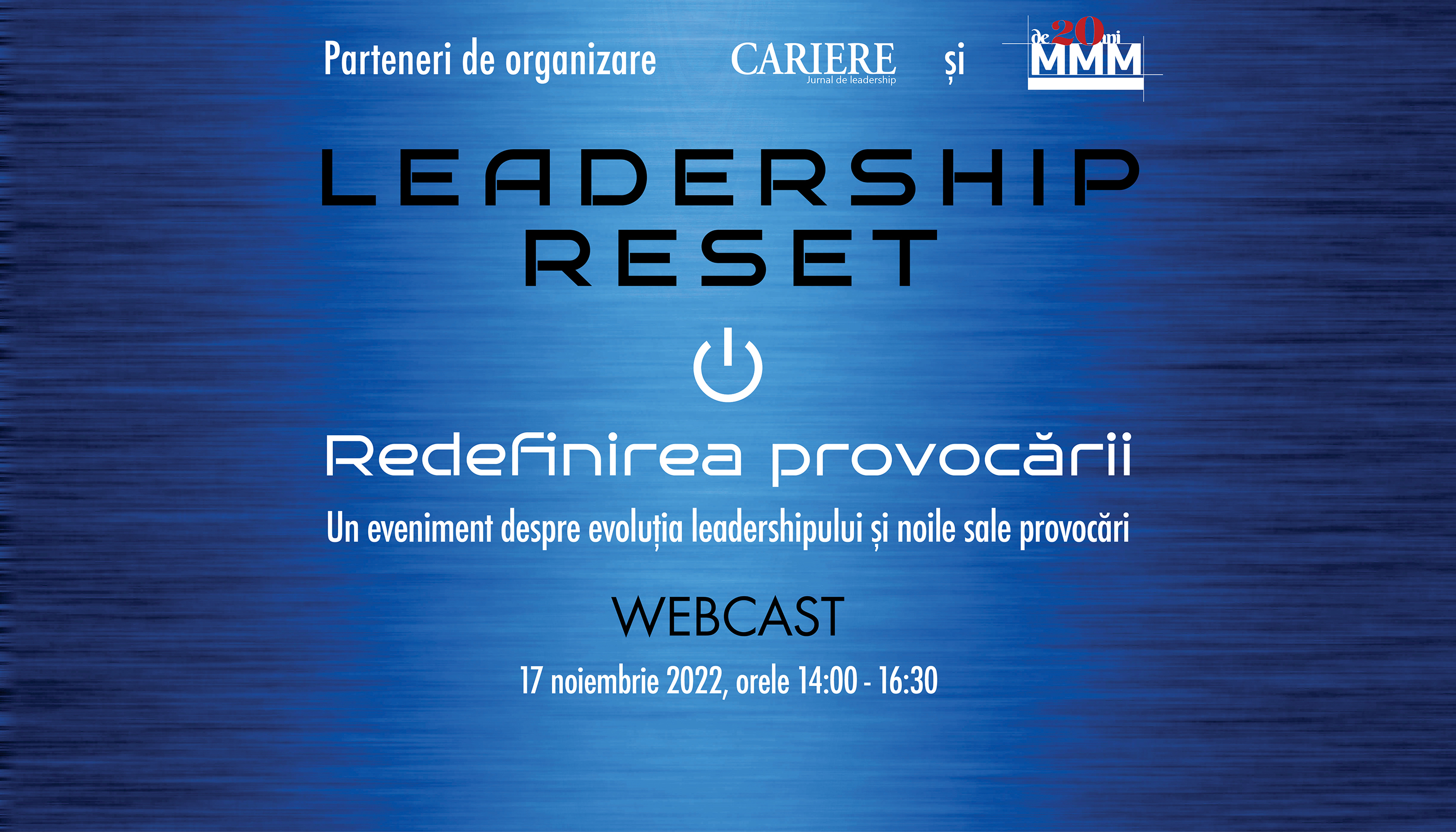 UPDATE: În AGENDĂ puteți viziona acum toate prezentările individuale din cadrul acestui eveniment AGENDA: 14.00 – 14.05 Deschidere eveniment - Cati Lupașcu, Redactor-șef Revista CARIERE 14.05-14.25 – „Perspective și retrospective: leadershipul ultimilor și viitorilor 20 de ani!” Context: Leadershipul evoluează și noi suntem martorii acestei transformări. Ultimii 20 de ani au fost pentru dezvoltarea Leadershipului în România, în mediul privat, o adevarată școală de dezvoltare personală și profesională, de evoluție a oamenilor și companiilor. La ce să ne așteptăm pentru următorii 20 de ani și ce ne dorim de la acești 20 de ani în privința dezvoltării noastre ca mediu de afaceri și ca societate? Speaker: Madi Rădulescu, Executive Coach, MCC, MBA, Managing Partner, MMM Consulting Prezentarea o puteți urmări AICI 14.25 – 14.45 LEADERSHIP contemporan într-o societate pseudo-modernă. O prelegere despre pseudo-modernismul românesc în cheia celor trei aspecte definitorii ale sale:- Implicarea în viața publică și socială la cote foarte scăzute față de media europeană;