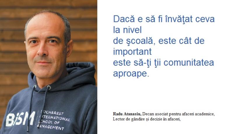 Bucharest International School of Management – BISM este una dintre școlile care în timpul pandemiei au avut mai mulți studenți decât de obicei. Pare că oamenii, crede Radu Atanasiu, Decan asociat pentru afaceri academice, Lector de gândire și decizie în afaceri, au avut și mai mare nevoie, în ultimii doi ani, pe lângă structurarea cunoștinţelor și a filosofiei de business oferită de un astfel de program, și de creștere personală, de ieșire din bula proprie și din zona de confort.