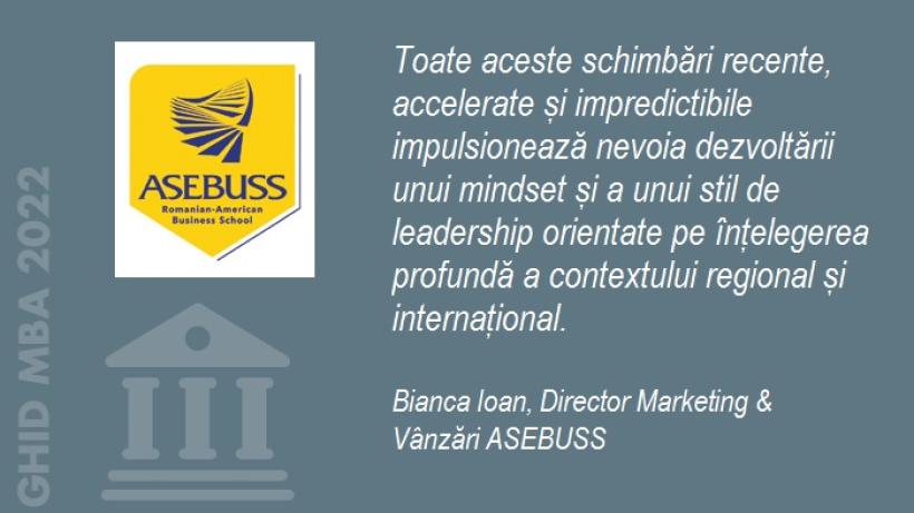 „Toate aceste schimbări recente, accelerate și impredictibile impulsionează nevoia dezvoltării unui mindset și a unui stil de leadership orientate pe înțelegerea profundă a contextului regional și internațional. Participanții în programele EMBA ASEBUSS sunt profesioniști cu rezultate remarcabile și deschidere de a îmbrățișa o experiență de învățare complexă, alături de colegi ambițioși și deciși să impulsioneze și să susțină schimbarea în companiile în care activează. Abordarea ASEBUSS este relevantă pentru mediul de afaceri local, cu expertiză în zona internațională, fiind bazată pe un model de învățare accelerată, cu studii de caz de actualitate, împreună cu echipa de practicieni din România, Europa și SUA”.