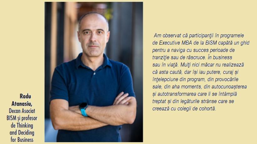 Să încerc o analogie: La prima vedere, un restaurant este doar locul unde te duci dacă ţi-e foame. De fapt, de cele mai multe ori mâncarea e doar jumătate de motiv. Mergem la restaurant și ca să socializăm, să sărbătorim, să ne răsfăţăm, să explorăm, să cunoaștem oameni noi sau să ne simţim speciali. În mod similar, la prima vedere, un Executive MBA este doar un program prin care managerii capătă cunoaștere aplicată (și aplicabilă) pentru a conduce proiecte și echipe. De fapt, managerii, profesioniștii și antreprenorii care vin la BISM să facă un astfel de program se află adesea într-o etapă de tranziţie. Sau chiar la o răscruce. Tranziţie de la un job la altul, de la o companie la alta, de la o poziţie ierarhică la alta sau de la o etapă din viaţă la alta, cu priorităţi și dorinţe noi.