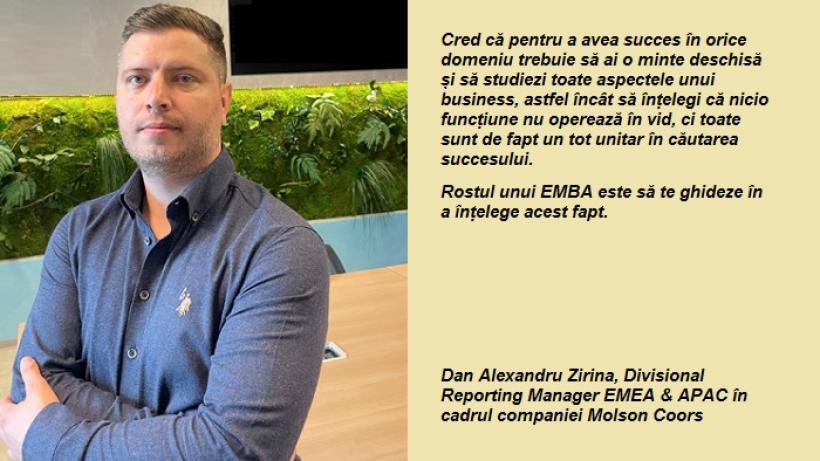 Dan Alexandru Zirina, Divisional Reporting Manager EMEA & APAC în cadrul companiei Molson Coors, este absolvent al programului Executive MBA în cadrul CITY College, Campusul European al Universității York. Deși a început programul de business în 2018, când nimeni nu se gândea că o pandemie ar putea fi posibilă, l-a încheiat prin cursuri online și studiu de acasă. Absolventul spune că dacă ar fi fost să înceapă un MBA în plină pandemie, s-ar fi gândit mai mult la această alegere, dar că, până la urmă, și în timpul unei crize un astfel de program își are rostul.
