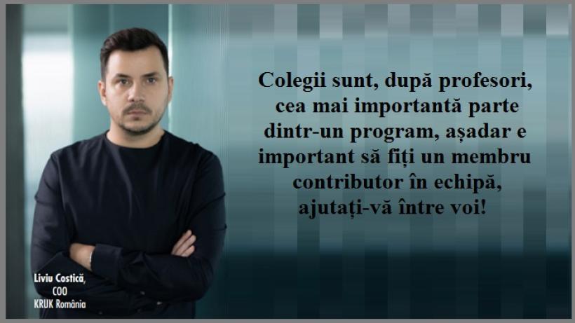 Din educația primită, am învățat să fiu curios, să vreau sa înțeleg „de ce-ul?” și „cum-ul?” fiecărei situații. A vrea să înțelegi structural situația de fapt precum și forțele care ne ghidează poate fi un challenge pentru status quo, iar acest demers nu poate aduce decât progres, atât în discuții cu oamenii din prima linie, cât și în momentul în care stabilim strategia companiei. La atitudinea aceasta a ajutat și focusul KRUK România pe o cultură LEAN, o cultură de îmbunătățire continuă, care are ca scop înțelegerea rădăcinii fiecărei probleme de care ne lovim, precum și o rezolvare metodologică. Adițional, deducția logică și zona de numerical reasoning au fost cele mai importante lucruri care m-au ajutat să înțeleg cum și când să intervin în business, dar tot ele m-au învățat că cifrele au limitari și a te duce în business, alături de oameni, pentru a înțelege problema de la sursă, e câteodată mai important decât orice altceva. În final, un manager este suma performanței echipei sale, așadar, poate mai mult decât diagrame strategice, dashboard-uri și tablouri Hoshin Kanri, echipa pe care am construit-o a fost cea care m-a propulsat și mi-a oferit motivația de a continua să fac ceea ce fac.