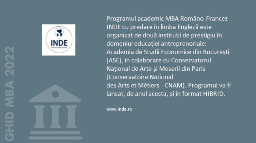Programul academic MBA Româno-Francez INDE cu predare în limba Engleză este organizat de două instituții de prestigiu în domeniul educației antreprenoriale: Academia de Studii Economice din București (ASE), în colaborare cu Conservatorul Naţional de Arte și Meserii din Paris (Conservatoire National des Arts et Métiers - CNAM).