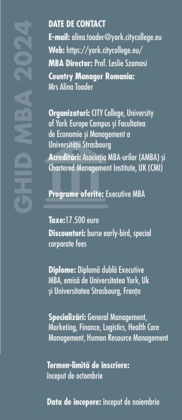 „Mă bucur pentru managementul și antreprenorii din România că pot accesa în București un program de o asemenea calitate academică și practică de la unele dintre cele mai renumite universităţi din lume, Universitatea York, UK și Universitatea Strasbourg, Franța. Sunt foarte fericită să îi expunem pe studenţi unui mediu extrem de internaţional prin cele trei călătorii externe din UK, Franţa și Grecia unde se întâlnesc cu colegii MBA din celelalte 8 țări unde predăm MBA-ul și astfel se bucură împreună de o experiență transformatoare, atât la nivel personal cât și profesional. Perspectiva internaţională este întărită și de corpul profesoral exclusiv internaţional cu vastă experiență în predare la nivel de MBA cât și practică. Absolvenții noștri cu cele 2 diplome de la Universitatea York, UK și Universitatea Strasbourg, Franţa, recunoscute mondial, pot munci sau deschide un business oriunde în lume, deoarece sunt echipați cu toate cunoștințele la zi și abilitățile necesare pentru o piaţă globală în continuă mișcare și transformare,” spune Alina Toader, Country Manager Romania CITY College, University of York Europe Campus.