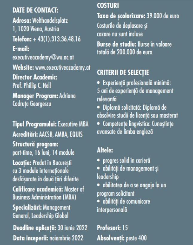 Lansat în anul 2006, Executive MBA Bucharest oferit de WU Executive Academy este singurul program de tip EMBA triplu-acreditat (EQUIS, AMBA și AACSB) din România. Calitatea sa este strâns legată de reputația profesorilor care predau la unele dintre cele mai prestigioase universități internaționale partenere, precum Carlson School of Management (SUA), IESE Business School (Spania) și Frankfurt School of Finance & Management (Germania), printre altele.