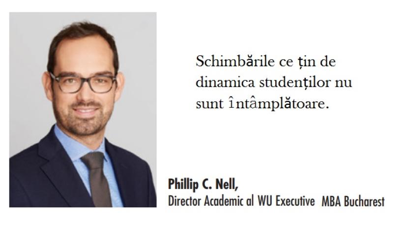 „În ultimii doi ani, corelați cu pandemia de COVID-19, ne-am bucurat de un număr-record de participanți în cadrul programului WU EMBA Bucharest și am asistat la o creștere a mediei de vârstă a acestora. Schimbările ce țin de dinamica studenților nu sunt întâmplătoare. Acestea indică nevoia managerilor cu experiență de a-și actualiza cunoștințele, pentru a putea aborda cu succes noile provocări ale mediului global de business, cum ar fi procesul de transformare digitală sau întreruperile din lanțul de aprovizionare. Programul nostru de Executive MBA este special conceput pentru a răspunde provocărilor reale cu care managerii se confruntă în industrii și funcții de business solicitante, oferindu-le ocazia de a implementa la locul de muncă instrumentele și cunoștințele noi de management dobândite la cursuri. Programul furnizează studenților toate abilitățile necesare pentru ca aceștia să-și maximizeze potențialul de a deveni lideri de talie mondială.” - Phillip C. Nell, Director Academic al WU Executive MBA Bucharest.