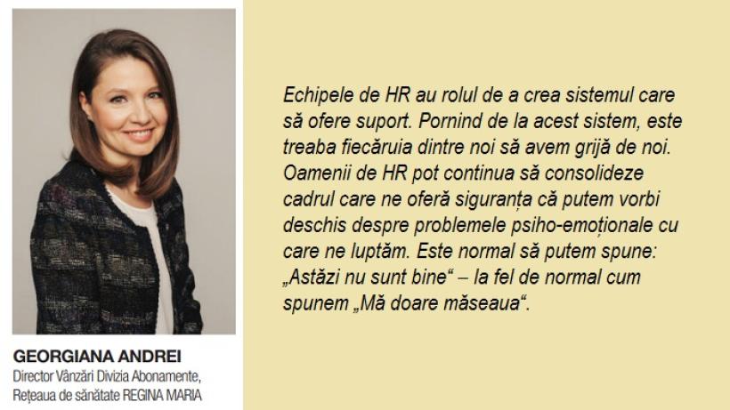 Rețeaua de sănătate REGINA MARIA observă un interes în creștere de 300% pentru serviciile de psihoterapie, față de perioada pre-pandemică, iar numărul abonaților care beneficiază de cel puțin 3 ședințe de psihoterapie acoperite de companie s-a dublat față de anul trecut. Despre acest subiect am discutat cu Georgiana Andrei, Director Vânzări Divizia Abonamente REGINA MARIA, în cadrul evenimentului FAST FORWARD. ORGANIZAȚIA VIITORULUI, Ediția a XVII-a, care a avut ca temă „fie Challenger Mindset for Leaders. Is Wellbeing the New Engagement?“ Georgiana Andrei a acceptat provocarea de a răspunde tuturor întrebărilor pe acest subiect important.