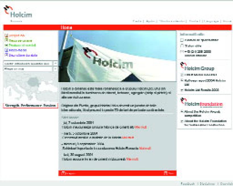 Meniul usor navigabil al site-ului va poarta de la informatii tehnice privind produsele companiei si ariile de aplicatie la versiunea digitala a minighidurilor de utilizare a cimentului si betoanelor - ideale in cazul in care va angajati intr-o activitate de constructie. Daca aspirati la o cariera alaturi de Holcim (Romania), incercarile voastre trebuie sa includa www.holcim.ro, unde veti gasi un formular online pentru aplicatii de CV-uri si anunturi cu joburile vacante.