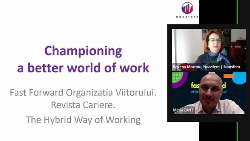 Cum se desfășoară munca și unde și când se întâmplă? Care sunt preferințele forței de muncă și cum se desfășoară oamenii? Care este dimensiunea și locația viitorului loc de muncă și care este combinația potrivită a portofoliului? Nu există nicio foaie de parcurs de urmat. În schimb, trebuie să navigăm în viitorul muncii cu agilitatea de a ne adapta la schimbările din perioada pandemiei și după. Despre distinctia dintre remote working prilejuit de pandemie și hybrid working ca parte din noul normal; cum gândim hybrid working astfel încât să asigure egalitate de șanse pentru toți și personalizarea relației dintre angajat și angajator?; cum ne ajută pasiunea pentru învățare?, am vorbit cu Roxana Mocanu, Chief „Game-Changer” Officer Noosfera, în cadrul ediției cu numărul XII a evenimentului #FastForward.OrganizațiaViitorului. Iată câteva idei desprinse din discursul Roxanei Mocanu:- Acest moment este unul de make-it or brake-it. Suntem cu capul în nori, dar cu picioarele pe pământ. Cumultă viziune dar și dorință de a schimba lumea.