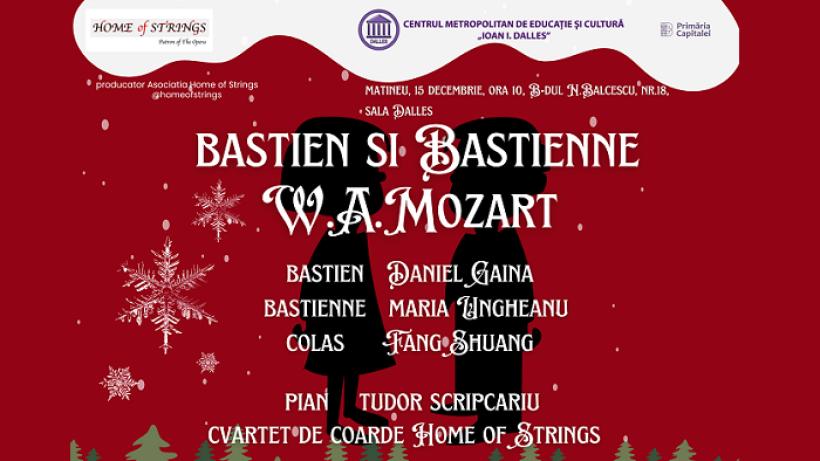 Asociația Home of Strings organizează a doua reprezentație a operei comice Bastien si Bastienne de W.A.Mozart, într-o atmosferă de poveste, în limba română, joi, 15 decembrie, ora 10, la sala Dalles din București, în cadrul proiectului cultural educational ‘’OPERA ÎN GRĂDINIȚE ȘI ȘCOLI’’.