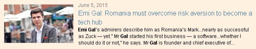 „Cred că România are capacitatea de a se transforma într-un hub tehnologic al Europei estice, întrucât avem extrem de multe talente în domeniul tehnic. Școlile de inginerie din timpul comunismului sunt încă la standarde de excelență. Dar avem nevoie de mai mult capital și trebuie să învingem această aversiune culturală față de risc”, crede Emi Gal. Ce-i de făcut? „Investitorii realizează că țara crește pe baza talentelor, dar și a politicilor. Iar asta trebuie să mențină interesul și să reducă reticența investitorilor”, spune tânărul businessman român, apreciind că autoritățile trebuie să depună mai multe eforturi pentru a încuraja startup-urile.