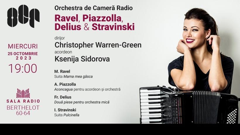 Seara de la Sala Radio mai cuprinde: Ravel - Suita Mama mea gâsca, Frederick Delius - Două piese pentru orchestră mică (On Hearing the First Cuckoo in Spring și Summer Night on the River) și Stravinski: Suita Pulcinella.