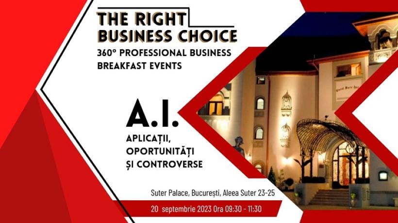 "The Right Business Choice", proiect de comunicare de business organizat de Revista Patronatului Român & Aura Icodin – fondator Centrul de limbi străine A_BEST, organizează pe 20 septembrie 2023, 9:30 – 11:30, la București, Suter Palace, Aleea Suter 23-25 un nou eveniment de tipul 360 professional business breakfast events cu tema: „A.I. Aplicații, oportunități și controverse”.