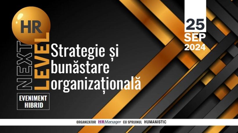 Revista HR Manager organizează cu sprijinul Humanistic, în data de 25 Septembrie 2024 evenimentul NEXT LEVEL HR, cu tema: STRATEGIE ȘI BUNĂSTARE ORGANIZAȚIONALĂ, eveniment ce se va desfășura în format hibrid: in-person, la Hotel Capital Plaza și online începând cu orele 10.00.