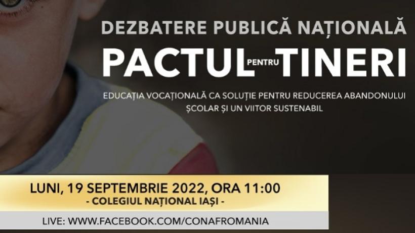 Confederația Națională pentru Antreprenoriat Feminin (CONAF)*, în parteneriat cu Ministerul Educației, Ministerul Familiei, Tineretului și Egalității de Șanse și Ministerul Muncii și Solidarității Sociale, Primăria Municipiului Iași și UNICEF, organizează prima conferință a proiectului național „Pactul pentru Tineri”, programată să aibă loc în data de 19 septembrie la Colegiul Național Iași.