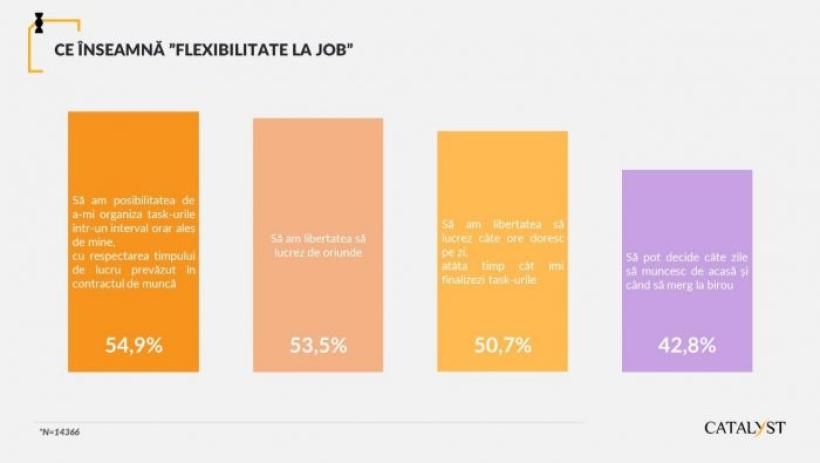 O întrebare care este adresată pentru prima oară respondenților în cadrul studiului face referire la ceea ce înseamnă pentru candidați flexibilitatea la job. Peste jumătate dintre ei (54,9%) înțeleg printr-un program flexibil posibilitatea de a-și organiza task-urile într-un interval orar ales, cu respectarea timpului de lucru prevăzut în contractul de muncă.