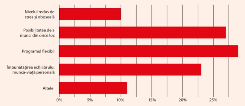 * Programul de lucru flexibil este, așadar, unul dintre avantajele preferate ale muncii la distanță, urmat de posibilitatea de a lucra de oriunde și de echilibrul viață profesională - viață personală îmbunătățit. Pentru a-și păstra o reputație atractivă pe piața competitivă a talentelor, angajatorii ar trebui să înțeleagă ce îmbunătățiri semnificative aduc aceste avantaje în viața cotidiană a angajaților și a candidaților.