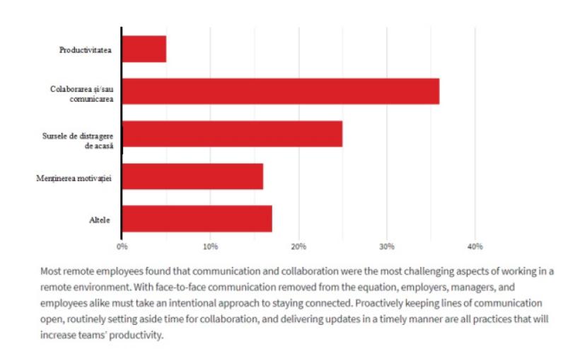 * Majoritatea angajaților care au lucrat la distanță au constatat că cele mai mari provocări ale muncii la distanță sunt cele legate de comunicare și colaborare.