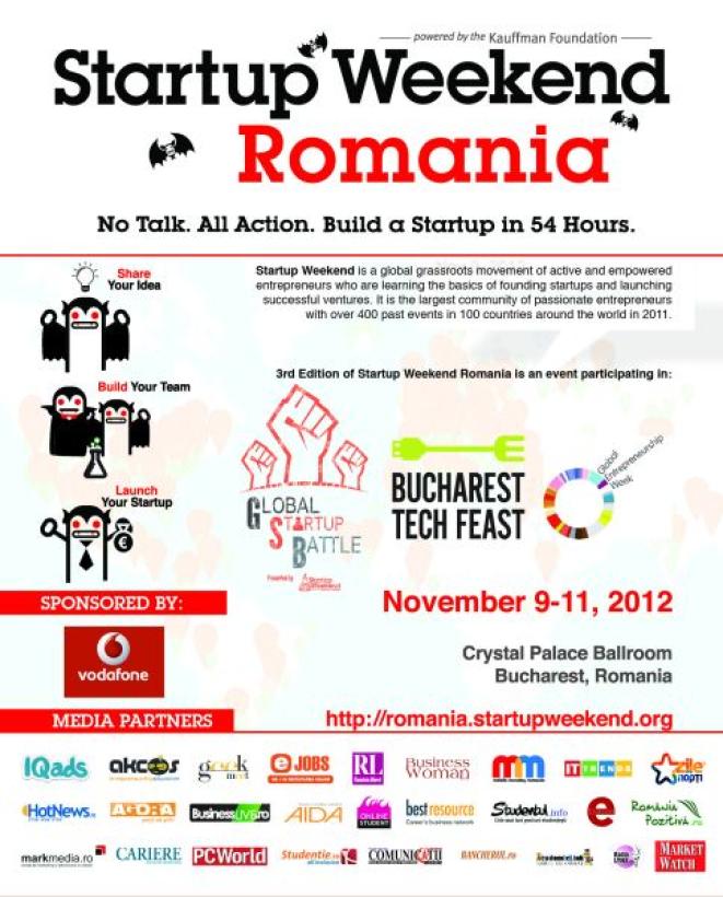 Proiect organizat în cadrul Bucharest Tech Feast, Startup Weekend este un eveniment de 54 de ore care aduce împreună tineri pasionaţi de antreprenoriat care formează echipe în jurul ideilor participanţilor, dezvoltă produse şi lansează noi companii în doar trei zile. La final, echipele participante îşi prezintă conceptul de business în faţa unui juriu de specialitate.