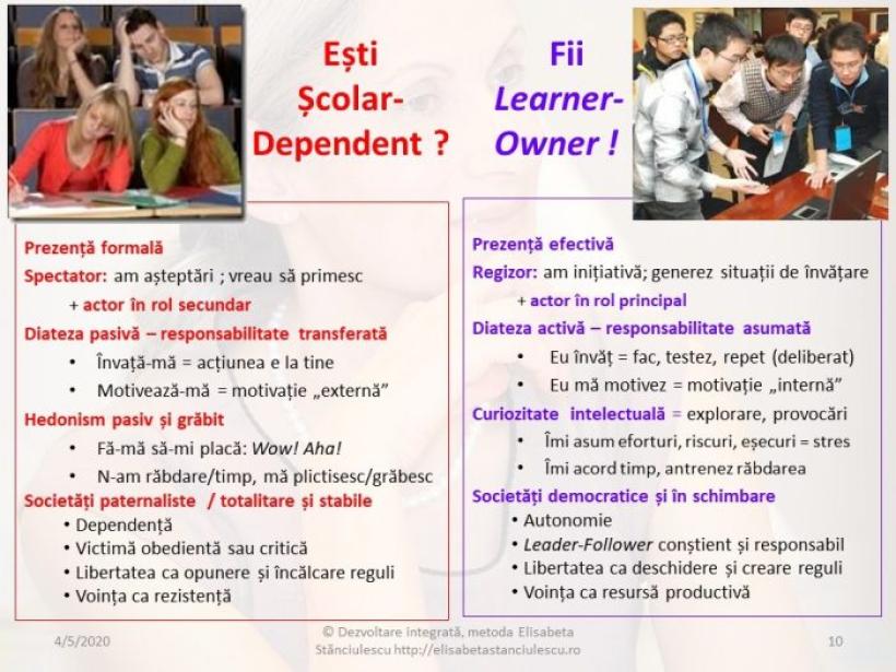 Puțini clienți intră în proces cu această atitudine de Learner = om care își asumă pe deplin rolul de „proprietar” al procesului său de învățare. Mulți sunt, la început, mai aproape de atitudinea clasică de Școlar dependent care gândește „profesorul/coachul e responsabil pentru rezultatele mele, el trebuie să mă motiveze, el trebuie să mă facă să-mi placă”. Unul dintre beneficiile foarte importante ale coachingului bine ghidat e tocmai acesta: coachingul îi ajută pe oameni să se deplaseze progresiv pe axa Școlar – Learner tot mai aproape de Learner.