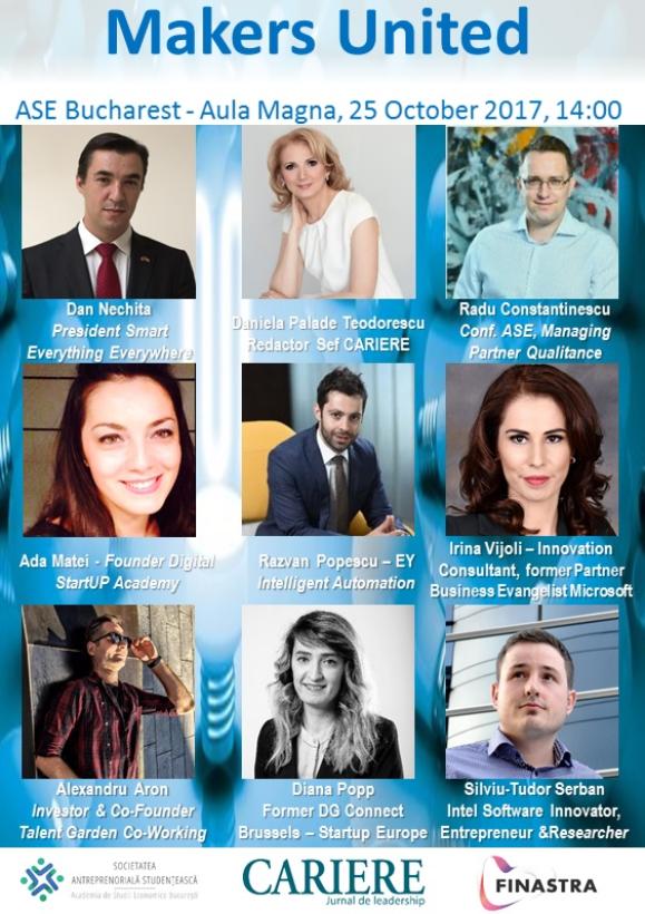Perspectiva asupra acestor subiecte va fi oferită de reprezentanţi ai mediului corporate (firma de consultanţă EY – Intelligent Automation , Microsoft - former Partner Business Evangelist, Innovation Consultant), dar şi reprezentanţi ai structurilor europene (DG Connect & Startup Europe Brussels) şi ai programelor de accelerare startups (Finastra – Hackathon program, Societatea Antreprenorială Studenţească ASE Bucureşti).