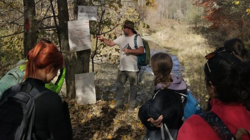 Foto: Anca Iosif - Rețeaua pentru Natură Urbană și Oltenia de sub Munte organizează printre altele și o școală de mediu pentru jurnaliști. Aici, Florin Stoican explica grupului din 2024 etapele și felurile exploatărilor forestiere.