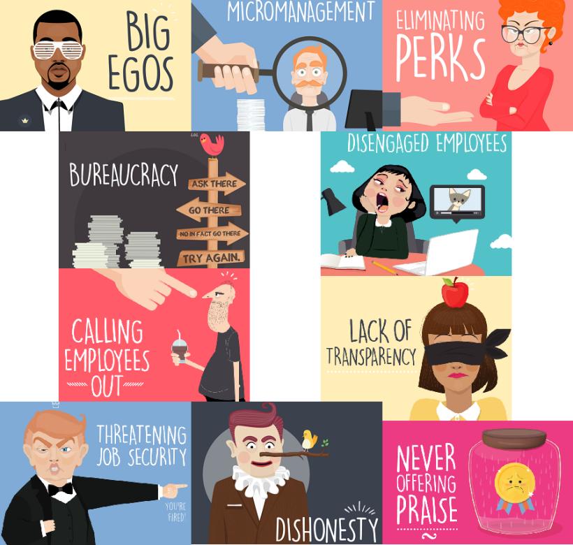 1. Ego-uri puternice. Managerii şi colegii cu personalităţi (prea) puternice tind să sufoce iniţiativa şi entuziasmul unui angajat implicat, mai ales dacă acesta se timorează uşor în faţa autorităţii. Orgoliile care se ciocnesc sunt şi ele dăunătoare mediului de lucru, oricare ar fi raportul dintre personalităţi – pe verticală (manager - subordonat) sau pe orizontală (între colegi).