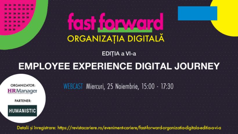 Revista HR Manager împreună cu Humanistic, partener al evenimentului, organizează miercuri, 25 noiembrie, între orele 15:00 - 17:30, a 6-a ediție din seria de evenimente online „FAST FORWARD. ORGANIZAȚIA DIGITALĂ”. Dezbaterile conferinței se concentrează pe parcursul angajatului, privit acum din perspectiva muncii de la distanță, precum și pe modalități digitale și abordări creative prin care angajatorul poate crea o experiență cu adevărat motivantă pentru angajat, de la campaniile de atragere de candidați și recrutare până la experiențele gândite pentru onboarding și induction, care se desfășoară acum online pentru cele mai multe companii. La începutul anului 2020, în martie, experiența angajatului se schimbă radical. În procesele de recrutare și de atragere de candidați se adaptează și se înlocuiesc toate experiențele care puteau fi gândite. Programele de onboarding se opresc sau ajung să fie mutate în online. Prima zi la birou devine ziua în care sistemul funcționează pe laptopul primit prin curier. Discuțiile valoroase de pe coridor se opresc. Clădirea facută cu un designer, cu mese și scaune perfect alese, nu mai are loc în noua realitate. Această ediție aduce în discuție subiecte legate de identitatea culturală în condițiile muncii la distanță, de metode noi de atragere, recrutare și păstrare a angajaților în companii, precum:- Cum putem desena acum un “Employee Experience Digital Journey”?
