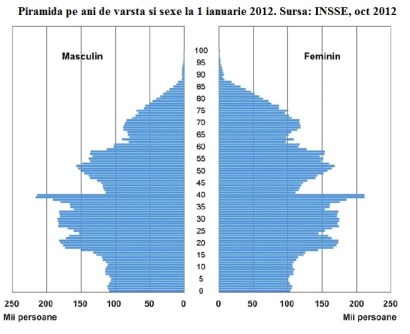 Piramida vârstelor în România arată în 2012 în felul următor: