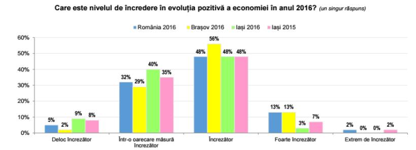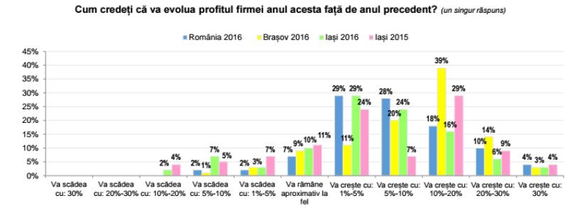 26% dintre cei intervievați cred că afacerile lor vor înregistra creșteri cuprinse între 10% și 20% în 2016 față de 2015, 15% dintre repondenți apreciază că volumul lor de afaceri va fi mai mare cu peste 20% anul acesta și doar 8% dintre cei intervievați văd o contracție a afacerilor în 2016. 52% dintre repondenții ieșeni văd o creștere iminentă a numărului de angajați, ca nevoie obiectivă generată de o economie în creștere.