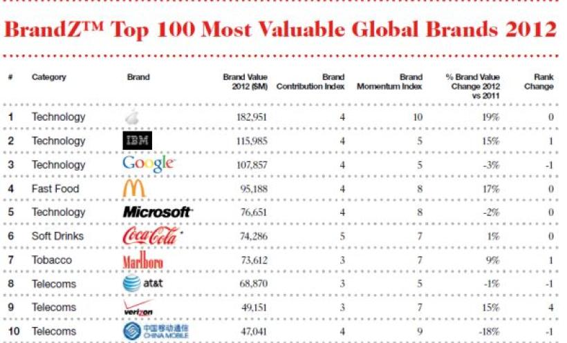 Apple își menține poziția de lider pentru al doilea an consecutive, după ce valoarea companiei a crescut cu 19%, până la 182,9 miliarde dolari. IBM a crescut cu 15% in valoare, până la 115,9 miliarde dolari, și a devansat Google, care coboară pe poziția a treia, cu o valoare de 107,8 miliarde dolari. Înainte de listarea publică și la opt ani de la înfiintare, valoarea Facebook s-a majorat cu 74%, devenind brandul cu cea mai mare creștere din top și urcând de pe poziția 35 pe locul 19.