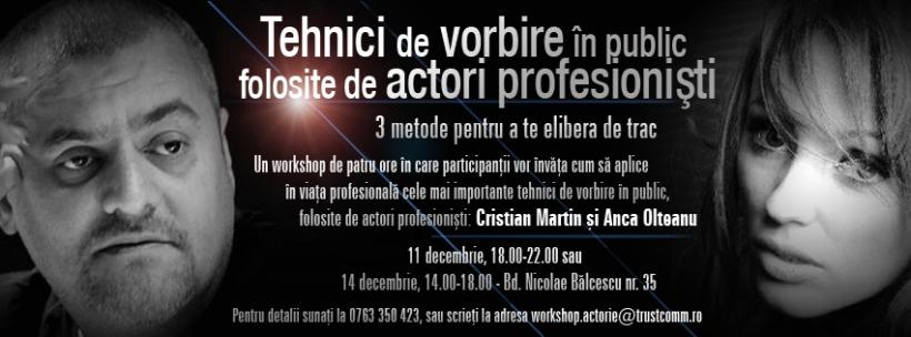 Actorii Cristian Martin și Anca Olteanu te ajută, într-un workshop de 4 ore, să reușești să-ți învingi fricile și prejudecățile și să ai o apariție impunătoare și credibilă atunci când vorbești în public.