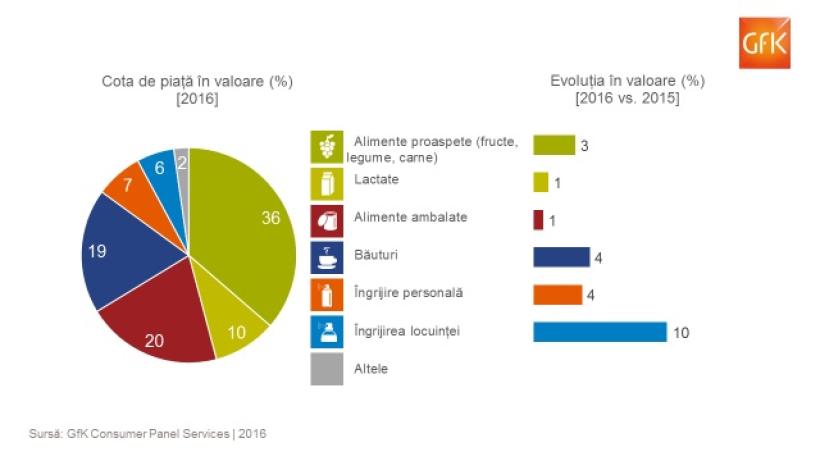 Cel mai mare ritm de creștere l-au avut produsele de îngrijire a locuinței, băuturile și produsele de îngrijire personală. Totuși, dacă luăm în considerare mărimea segmentelor de categorii, alimentele proaspete și băuturile au fost cele care au contribuit cel mai mult la creșterea pieței FMCG. Printre categoriile care au înregistrat creșteri în 2016 sunt: fructele de mare și peștele, alimentele congelate, fructele exotice (avocado, rodii etc), cidrul, șampania etc.