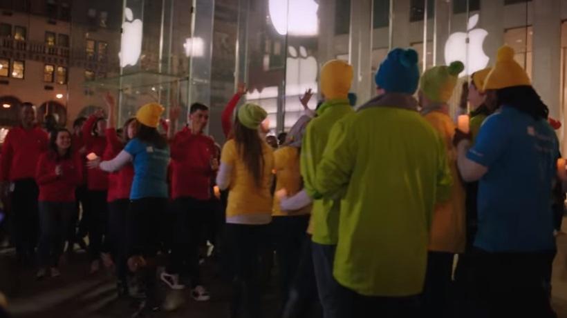 În reclama filmată pe 5th Avenue, zeci de angajați ai Microsoft își părăsesc locul de muncă pentru a ajunge în fața principalului magazin Apple din New York.
