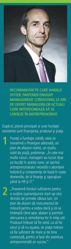 „De obicei, între 40% și 50% din start-up-uri se axează pe inovație și, cu alte cuvinte, restul de 50% până la 60% sunt nevoite să împartă împreună cu competitorii o piață mică. Alte motive țin de lipsa de subvenții guvernamentale, de birocrație, neclarități legislative, lipsa reglementărilor, fiscalitate, lipsa infrastructurii etc.” Chiar și așa, Ditter are în minte un exemplu foarte clar de business de succes creat de niște foști manageri: lanțul de farmacii Sensi Blu. „Fondatorii și-au dat seama, la acel moment, că un astfel de model lipsea din piață și au avut cunoștințele necesare să conducă o astfel de companie – cunoștințe dobândite anterior în funcții de management.”