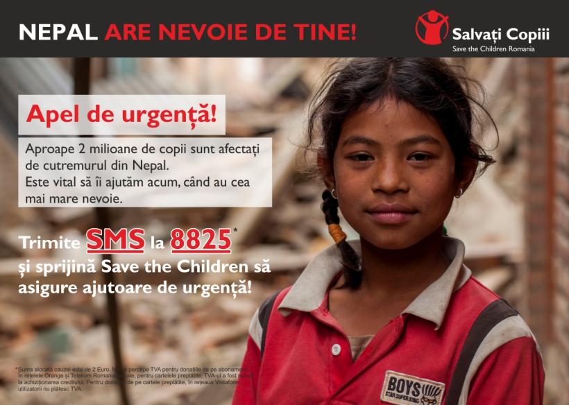 “Lansăm şi noi, Salvaţi Copiii România, un apel de urgenţă pentru a-i ajuta pe cei vulnerabili din Nepal, care au nevoie de noi. Puteţi să donaţi 2 euro la SMS 8825şi veţi contribui la distribuirea ajutoarelor vitale. Suntem în legătură strânsă cu colegii noştri de la Save the Children Nepal, iar fondurile strânse vor ajunge la ei în cel mai scurt timp”, a declarat Gabriela Alexandrescu, Preşedinte Executiv Salvaţi Copiii.