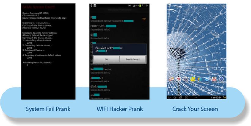 O aplicație foarte realistă prin care ne putem face prietenii să creadă că le-am stricat telefonul mobil este Crack Your Screen, care face ecranul telefonului să pară că a fost spart. Din aceeași categorie, Burn Phone Prank dă impresia că ecranul telefonului a fost ars.