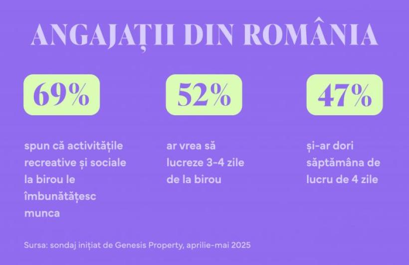 Sondajul Genesis Property confirmă o schimbare de paradigmă în piața muncii din România: angajații nu mai caută doar salarii competitive sau avansări în carieră, ci un model de lucru care să le permită să fie și profesioniști performanți, și oameni prezenți în viața personală. Cultura organizațională și spațiile de lucru care încurajează această viziune devin cheia pentru atragerea și retenția talentelor în 2025 și dincolo de el.