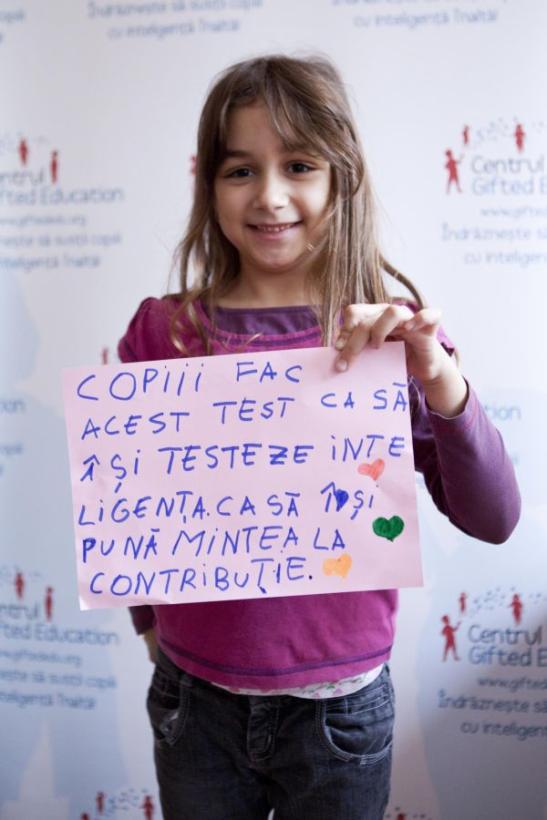 Testul are dificultate medie şi vizează verificarea cunoştinţelor generale ale copiilor, perspicacitatea, creativitatea, vederea în spaţiu, inteligenţa emoţională si spirituală. „Nu este un test de stabilire a coeficientului de inteligenţă, ci unul care ne ajută să scoatem la iveală acele capacităţi deosebite ale copiilor care pot trece neobservate la şcoală. Acest test poate fi pentru mulţi paşaportul către un centru de excelență pentru copiii supradotați, Centrul Gifted Education, care beneficiază de un program academic extracurricular specializat pentru copiii supradotaţi, de profesori talentaţi şi de cele mai bune tehnologii didactice, validate la nivel internaţional”, a declarat Monica Gheorghiu, managerul şi unul dintre fondatorii Asociaţiei „Centrul Gifted Education”.