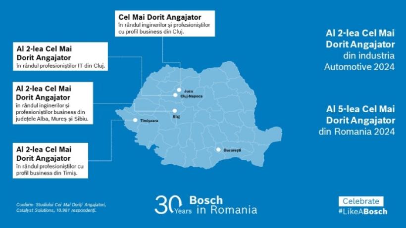 București, Blaj, Cluj, Sibiu și Timișoara – Bosch, lider global în furnizarea de tehnologii și servicii, se clasează, și în 2024, între cei mai doriți angajatori din România. La nivel național, Bosch ocupă poziția cinci din 100 în topul celor mai doriți angajatori realizat de Catalyst Solutions în 2024, și rămâne, pentru al șaselea an consecutiv, al doilea cel mai dorit angajator din industria automotive. La nivel local, Bosch rămâne cel mai dorit angajator în rândul inginerilor și profesioniștilor în domeniul business din Cluj și se află pe locul secund în județ în preferințele specialiștilor IT. De asemenea, Bosch este pe poziția a doua în topul celor mai doriți angajatori pentru ingineri și candidații cu profil de business din județele Alba, Mureș și Sibiu, iar în Timișoara, compania se regăsește pe poziția a doua în preferințele candidaților cu profil business.